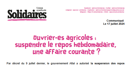 Par décret du 9 juillet dernier, le gouvernement Attal a autorisé la suspension des repos hebdomadaires des salarié·es agricoles par leurs employeurs pour des travaux dont l’« exécution ne peut être différée », comme des récoltes manuelles dans les régions agricoles dotées d’une appellation d'origine contrôlée ou une indication géographique protégée.