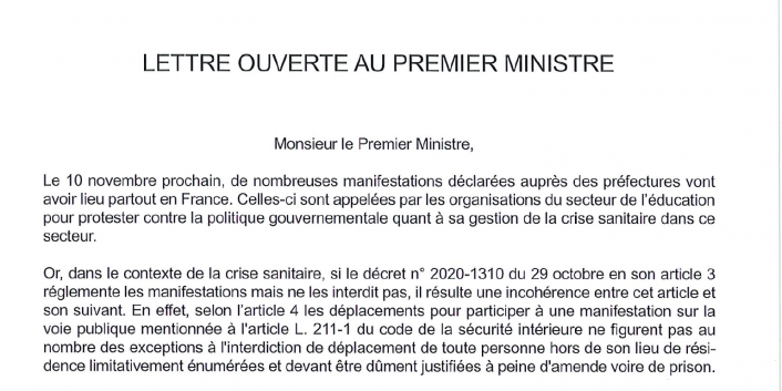 Courrier au Premier Ministre signé par la présidente du Syndicat des avocats de France, la présidente du syndicat de la Magistrature et les co-délégué.es généraux de l'Union syndicale Solidaires concernant la possibilité de se rendre aux manifestations dans la période.