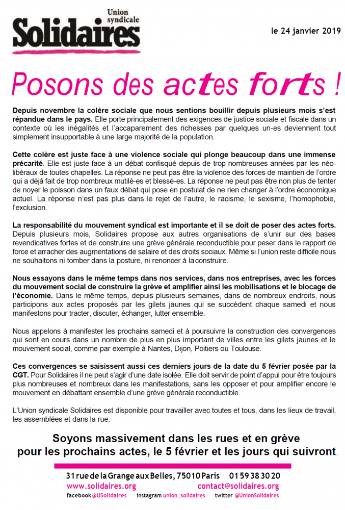 Nous appelons à manifester les prochains samedi et à poursuivre la construction des convergences qui sont en cours dans un nombre de plus en plus important de villes entre les gilets jaunes et le mouvement social, comme par exemple à Nantes, Dijon, Poitiers ou Toulouse.