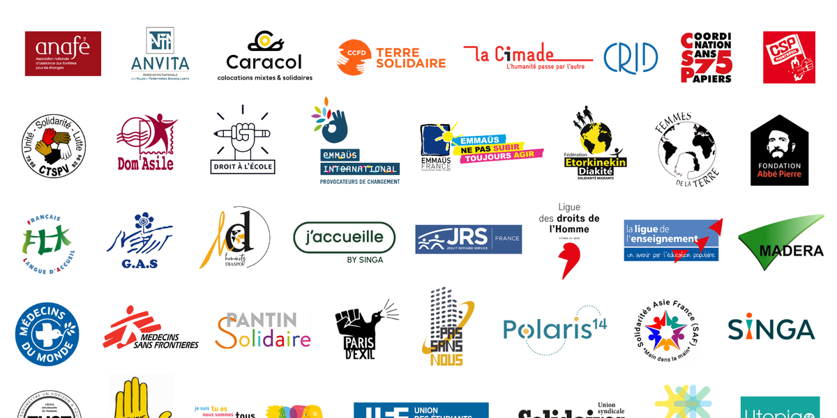 Organisations signataires : Anafé, ANVITA, Caracol, CCFD-Terre Solidaire, Cimade, CRID, Coordination 75 des Sans Papiers (CSP75), Collectif des Sans papiers de Montreuil (CSPM), Collectif des travailleurs sans-papiers de Vitry-sur-Seine (CTSPV 94), Dom'Asile, Droit à l’école, Emmaüs International, Emmaüs France, Fédération Etorkinekin Diakité, Femmes de la Terre, Fondation Abbé Pierre, Français langue d’accueil, Groupe Accueil et Solidarité (GAS), Humanity Diaspo, J’accueille by SINGA, JRS France, Ligue des droits de l’Homme (LDH), Ligue de l'Enseignement, MADERA, Médecins du Monde, Médecins Sans Frontières (MSF), Pantin Solidaire, Paris d'Exil, Pas Sans Nous, Polaris 14, Solidarités Asie France (SAF), SINGA, SOS Racisme, Thot, Tous Migrants, Union des Etudiants Exilés (UEE), Union syndicale Solidaires, UniR, Utopia 56.