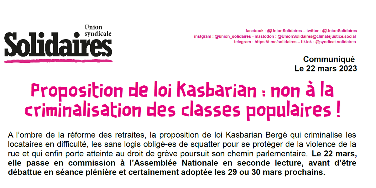 A l’ombre de la réforme des retraites, la proposition de loi Kasbarian Bergé qui criminalise les locataires en difficulté, les sans logis obligé-es de squatter pour se protéger de la violence de la rue et qui enfin porte atteinte au droit de grève poursuit son chemin parlementaire. Le 22 mars, elle passe en commission à l’Assemblée Nationale en seconde lecture, avant d’être débattue en séance plénière et certainement adoptée les 29 ou 30 mars prochains.