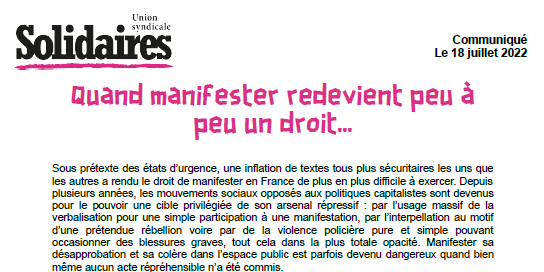L’Union syndicale Solidaires se félicite de ces avancées, le juge judiciaire ayant cette fois rempli son rôle de gardien des libertés individuelles. Même s’il n’appartient pas au juge de réécrire la loi ou les règlements, la jurisprudence doit permettre d’avancer sur d’autres points liés à la liberté de manifester.