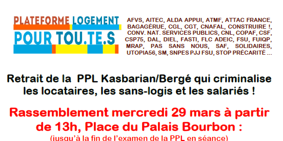 La Plate-Forme Logement pour TouTEs et le Collectif des Associations Unies – CAU - appellent à se rassembler mercredi 22 mars, à partir de 13h Place du Palais Bourbon, lors des débats en séance de la 2e lecture de la PPL Kasbarian-Bergé votée par Renaissance, LR et RN à l’Assemblée et au Sénat. Elle est d’une grande brutalité pour les sans-logis et les locataires, alors que notre pays s’enfonce dans la crise du logement :