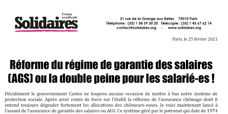En clair, les salarié-es vont encore faire les frais de cette nouvelle réforme. La crise menace fortement leurs emplois et ils et elles ne sont même pas sûr-es de pouvoir être indemnisé-es des préjudices subis. Double peine insupportable : que ce soient contre les licenciements, contre la réforme de l’assurance chômage ou s’agissant du système des AGS, il est indispensable de créer le rapport de force pour faire barrage à ce gouvernement foulant aux pieds les urgences sociales. Quoiqu’il en soit, les salarié-es doivent rester les premières à être indemnisé-es en cas de liquidation judiciaire.