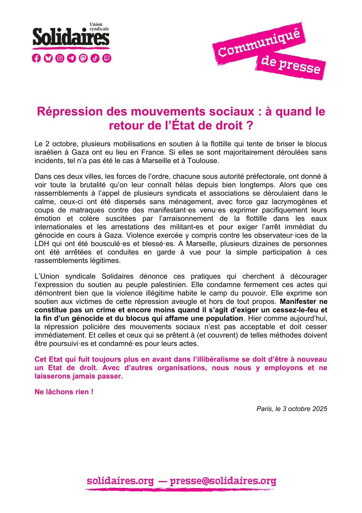 L’Union syndicale Solidaires dénonce ces pratiques qui cherchent à décourager l’expression du soutien au peuple palestinien. Elle condamne fermement ces actes qui démontrent bien que la violence illégitime habite le camp du pouvoir. Elle exprime son soutien aux victimes de cette répression aveugle et hors de tout propos. Manifester ne constitue pas un crime et encore moins quand il s’agit d’exiger un cessez-le-feu et la fin d’un génocide et du blocus qui affame une population. Hier comme aujourd’hui, la répression policière des mouvements sociaux n’est pas acceptable et doit cesser immédiatement. Et celles et ceux qui se prêtent à (et couvrent) de telles méthodes doivent être poursuivi·es et condamné·es pour leurs actes.