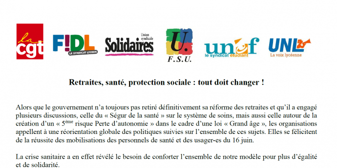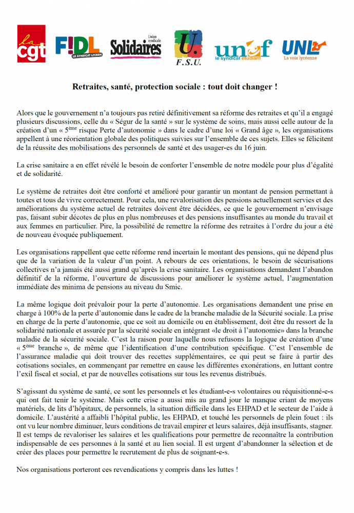 Alors que le gouvernement n’a toujours pas retiré définitivement sa réforme des retraites et qu’il a engagé plusieurs discussions, celle du « Ségur de la santé » sur le système de soins, mais aussi celle autour de la création d’un « 5 ème risque Perte d’autonomie » dans le cadre d’une loi « Grand âge », les organisations appellent à une réorientation globale des politiques suivies sur l’ensemble de ces sujets. Elles se félicitent de la réussite des mobilisations des personnels de santé et des usager es du 16 juin.