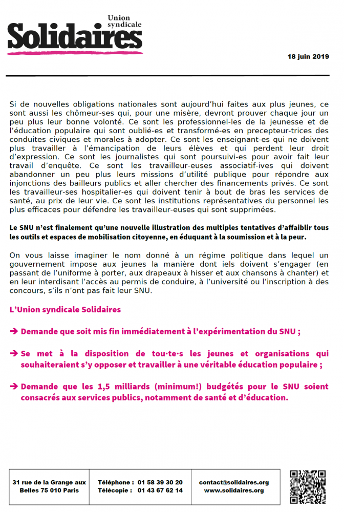 Le SNU n’est finalement qu’une nouvelle illustration des multiples tentatives d’affaiblir tous les outils et espaces de mobilisation citoyenne, en éduquant à la soumission et à la peur.
