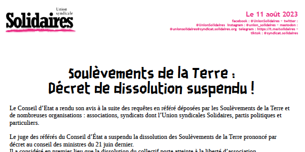 Le Conseil d’Etat a rendu son avis à la suite des requêtes en référé déposées par les Soulèvements de la Terre et de nombreuses organisations : associations, syndicats dont l’Union syndicales Solidaires, partis politiques et particuliers.