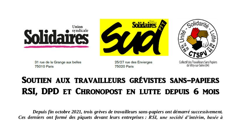 Depuis fin octobre 2021, trois grèves de travailleurs sans-papiers ont démarré successivement. Ces derniers ont formé des piquets devant leurs entreprises : RSI, une société d’intérim, basée à Gennevilliers (92), DPD, filiale de La Poste pour le colis, au Coudray-Montceaux (91) et Chronopost à Alfortville (94), autre filiale colis de La Poste. Ils réclament leur régularisation auprès des préfectures qui, depuis, font la sourde oreille.