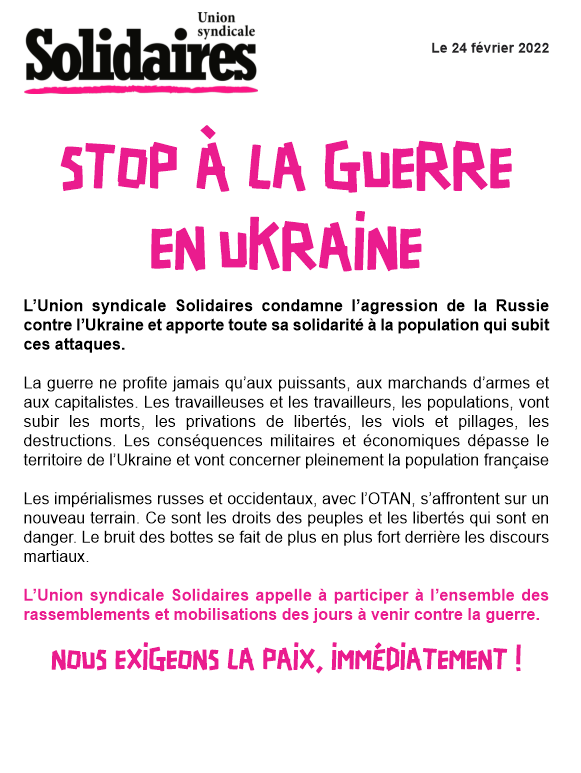 L’Union syndicale Solidaires condamne l’agression de la Russie contre l’Ukraine et apporte toute sa solidarité à la population qui subit ces attaques.