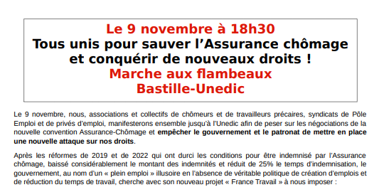 Le 9 novembre, nous, associations et collectifs de chômeurs et de travailleurs précaires, syndicats de Pôle Emploi et de privés d’emploi, manifesterons ensemble jusqu’à l’Unedic afin de peser sur les négociations de la nouvelle convention Assurance-Chômage et empêcher le gouvernement et le patronat de mettre en place une nouvelle attaque sur nos droits.