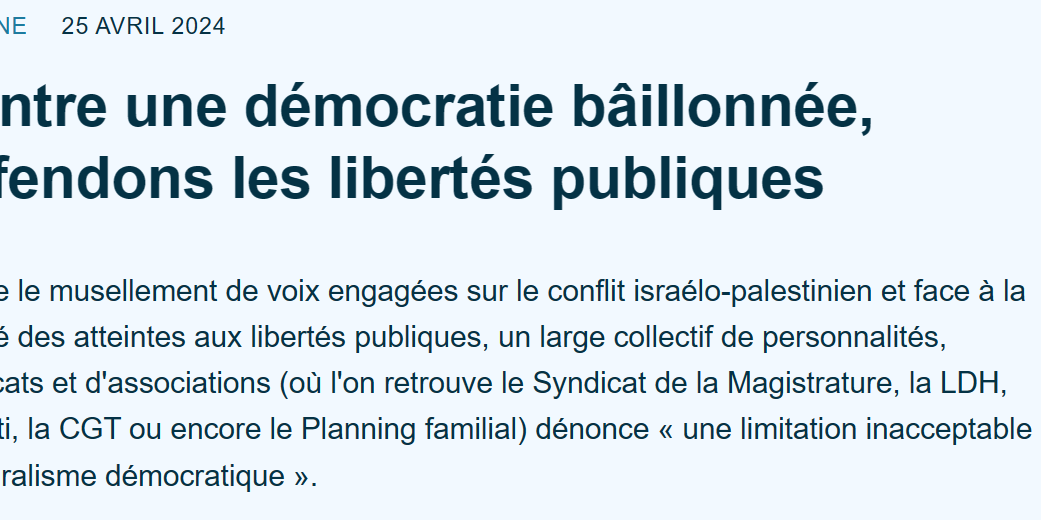 Les atteintes aux libertés ont désormais franchi de nouveaux caps : l’interdiction administrative – finalement suspendue – de la marche du 21 avril 2024 et l’interdiction par arrêté préfectoral, notamment pour risque de « trouble à l’ordre public » d’une conférence organisée par l’association Libre Palestine ».