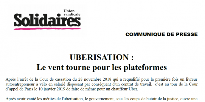 Après l’arrêt de la Cour de cassation du 28 novembre 2018 qui a requalifié pour la première fois un livreur autoentrepreneur à vélo en salarié disposant par conséquent d'un contrat de travail, c’est au tour de la Cour d’appel de Paris le 10 janvier 2019 de faire de même pour un chauffeur Uber.