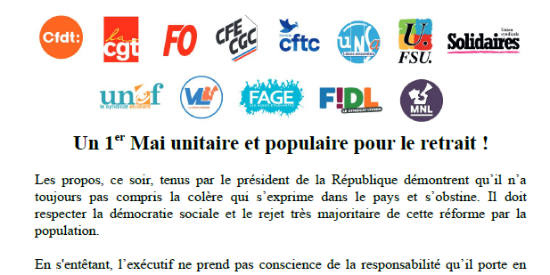 L’intersyndicale appelle à faire du 1er mai une journée de mobilisation massive, unitaire et populaire contre la réforme des retraites partout sur le territoire, dans le calme et la détermination. Elle invite tous les travailleurs et travailleuses, jeunes, retraité.es comme l’ensemble de la population à s’y rendre massivement, entre collègues de travail, amis, en famille pour obtenir l’abrogation de cette réforme injustifiée, brutale et injuste.