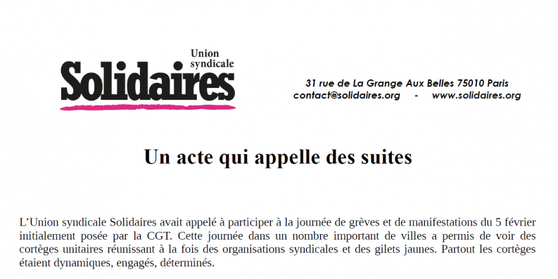 L’Union syndicale Solidaires avait appelé à participer à la journée de grèves et de manifestations du 5 février initialement posée par la CGT. Cette journée dans un nombre important de villes a permis de voir des cortèges unitaires réunissant à la fois des organisations syndicales et des gilets jaunes. Partout les cortèges étaient dynamiques, engagés, déterminés.