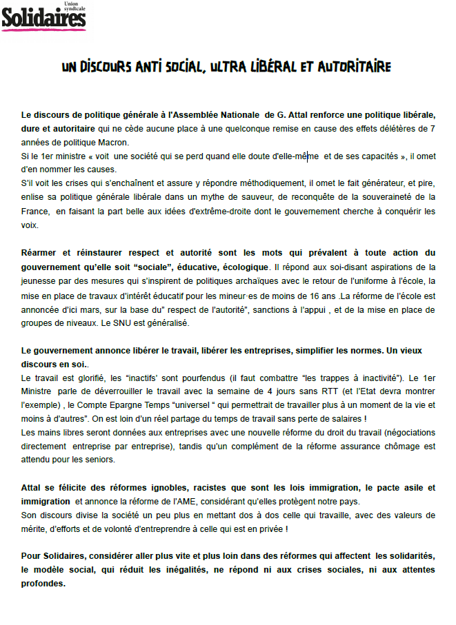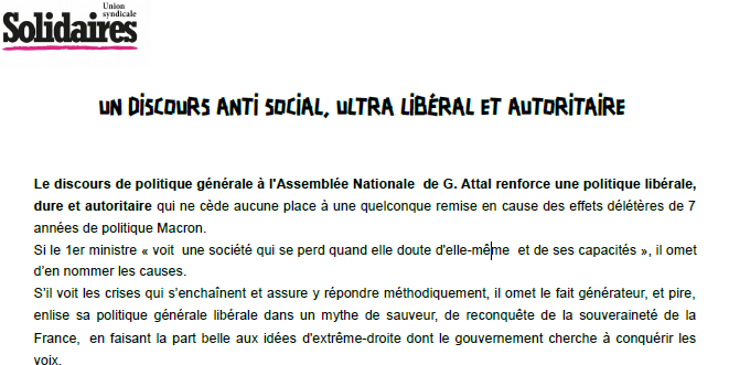 Le discours de politique générale à l'Assemblée Nationale de G. Attal renforce une politique libérale, dure et autoritaire qui ne cède aucune place à une quelconque remise en cause des effets délétères de 7 années de politique Macron.