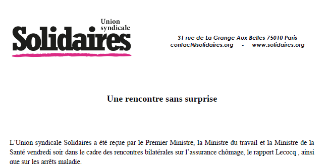 L’Union syndicale Solidaires a été reçue par le Premier Ministre, la Ministre du travail et la Ministre de la Santé vendredi soir dans le cadre des rencontres bilatérales sur l’assurance chômage, le rapport Lecocq, ainsi que sur les arrêts maladie.
