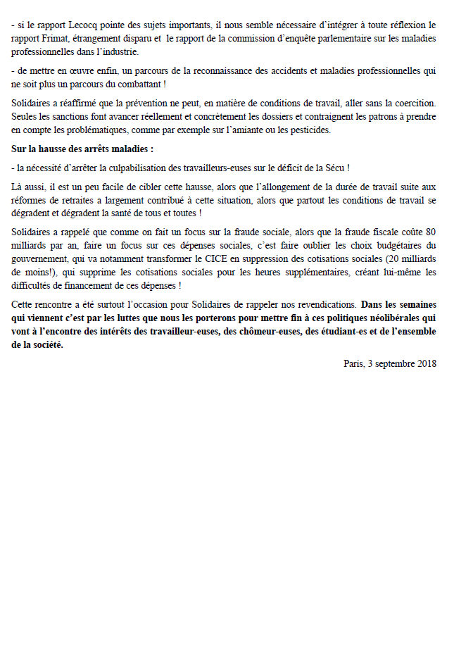 Nous avons souligné que ces rencontres se déroulaient dans un contexte général social et économique où le gouvernement fait le choix de donner toujours plus aux capitalistes au détriment de la population et que ce cadre contraint ne permet aucune réelle négociation. Pour nous c’est par le rapport de force que nous pourrons modifier les choses. Cette rencontre a été l’occasion de rappeler l’opposition de Solidaires à la non revalorisation des pensions et des prestations sociales, au prélèvement à la source, à la fausse solution de supprimer des cotisations sociales sur les heures supplémentaires qui supprime de fait ce qui constitue du salaire différé pour les salarié-es. Par ailleurs, nous avons dénoncé la vague de répression que subissent les militant-es et les salarié-es qui sont en lutte ou ont lutté, particulièrement les cheminot-es suite au dernier conflit du rail.