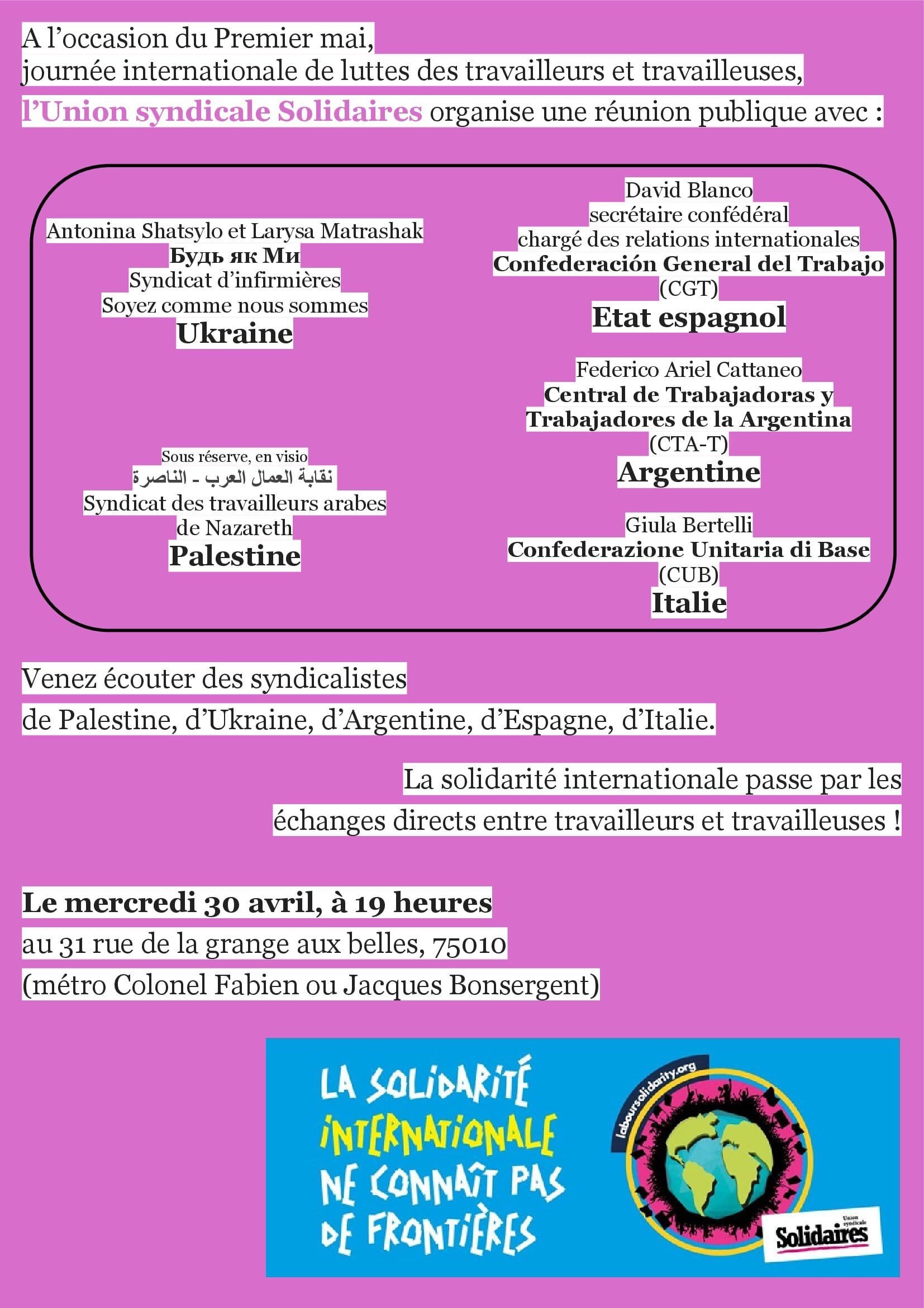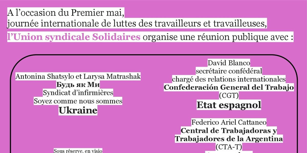 A l’occasion du Premier mai, journée internationale de luttes des travailleurs et travailleuses, l’Union syndicale Solidaires organise une réunion publique avec :