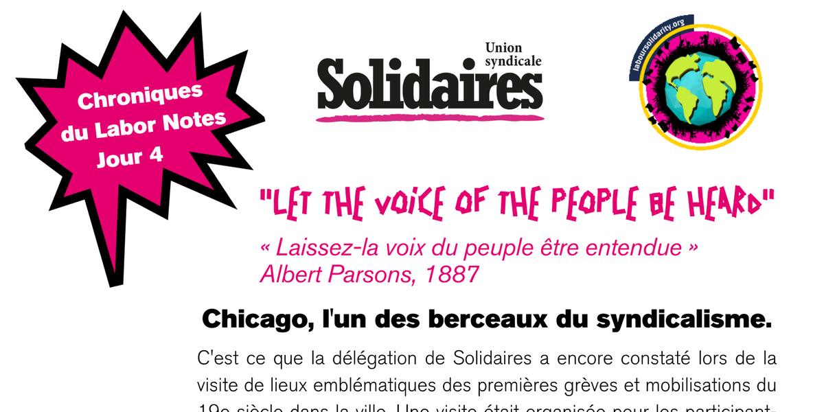 C'est ce que la délégation de Solidaires a encore constaté lors de la visite de lieux emblématiques des premières grèves et mobilisations du 19e siècle dans la ville. Une visite était organisée pour les participant-es au Labor Notes avec la Société d’Histoire du Travail de l’Illinois (Illinois Labor History Society).