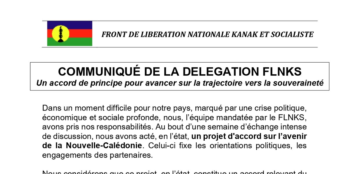 Dans un moment difficile pour notre pays, marqué par une crise politique, économique et sociale profonde, nous, l'équipe mandatée par le FLNKS, avons pris nos responsabilités. Au bout d'une semaine d'échange intense de discussion, nous avons acté, en l'état, un projet d'accord sur l'avenir de la Nouvelle-Calédonie. Celui-ci fixe les orientations politiques, les engagements des partenaires.