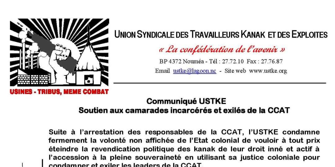 Suite à l'arrestation des responsables de la CCAT, l'USTKE condamne fermement la volonté non affichée de l'Etat colonial de vouloir à tout prix éteindre la revendication politique des kanak de leur droit inné et actif à l'accession à la pleine souveraineté en utilisant sa justice coloniale pour condamner et exiler les leaders de la CCAT.