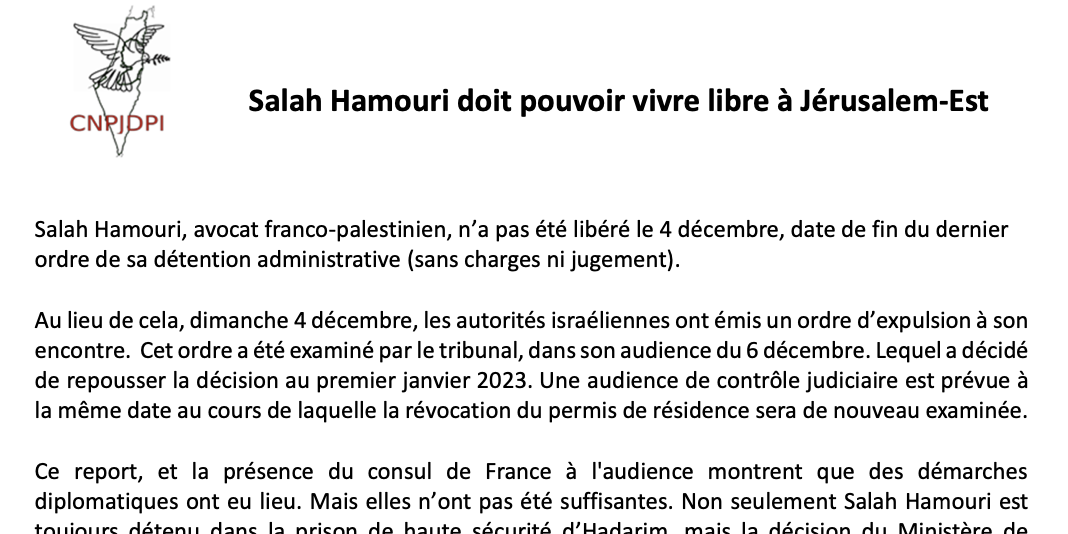 Communiqué CNPJDPI - Salah Hamouri doit pouvoir vivre libre à Jérusalem-Est