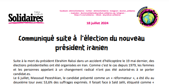 Suite à la mort du président Ebrahim Raïssi dans un accident d'hélicoptère le 19 mai dernier, des élections présidentielles ont été organisées en Iran. Comme c'est le cas depuis 1979, les femmes et les personnes appelant à un changement radical n'ont pas été autorisé∙es à se porter candidat.es.