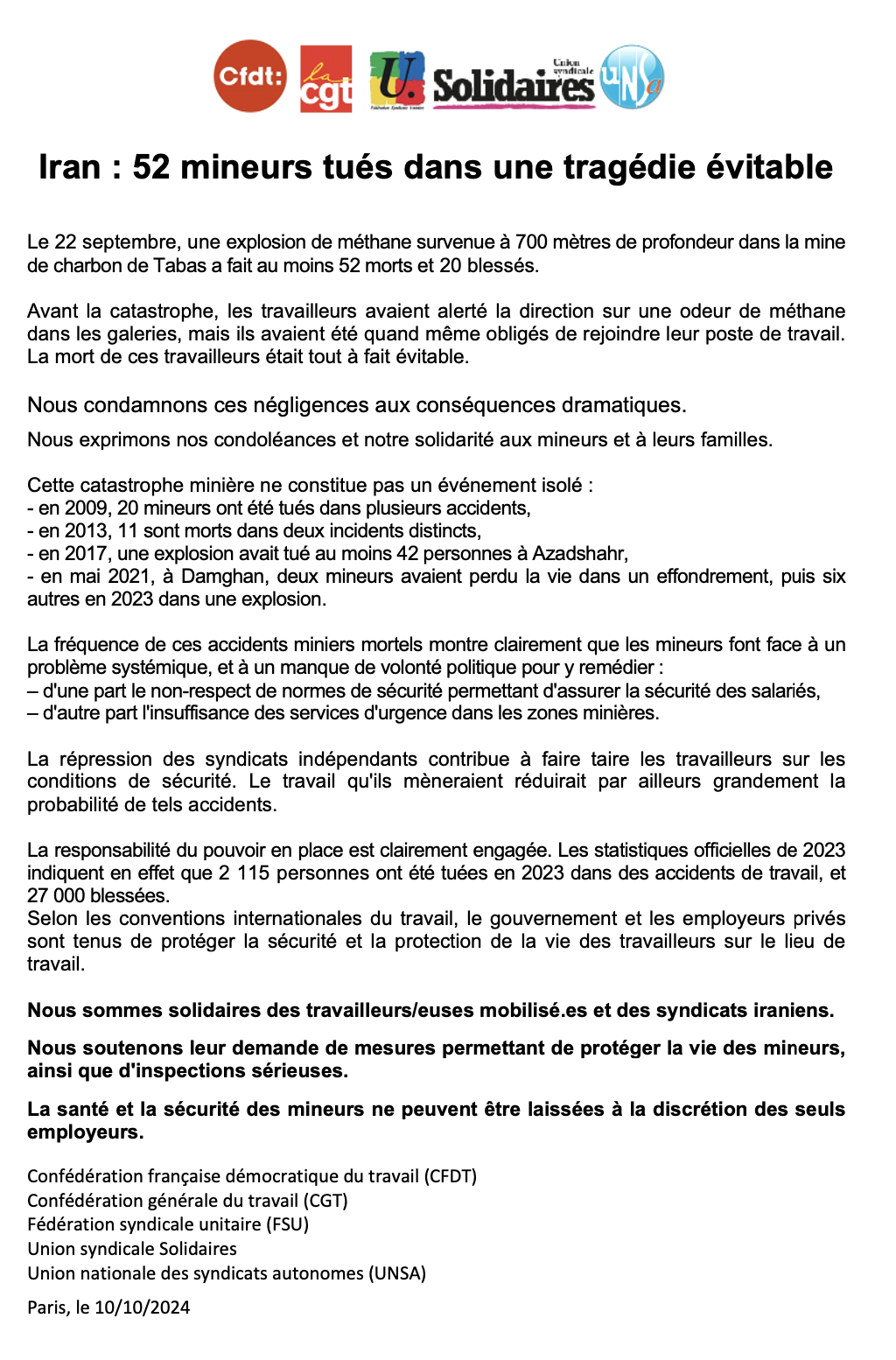 Nous exprimons nos condoléances et notre solidarité aux mineurs et à leurs familles.
