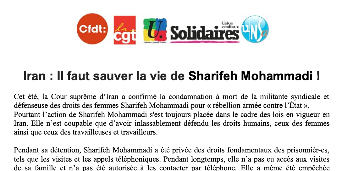 Les organisations syndicales CFDT, CGT, UNSA, Solidaires et FSU se joignent aux démarches de la Confédération syndicale internationale pour exhorter le gouvernement iranien d'annuler la condamnation à mort de Sharifeh et d'abandonner toute poursuites contre elle. La même demande est faite concernant tous et toutes les syndicalistes et autres défenseurs/euses des droits humains détenu-es pour avoir exercé leurs droits protégés par les Conventions de l'OIT et les Pactes internationaux.