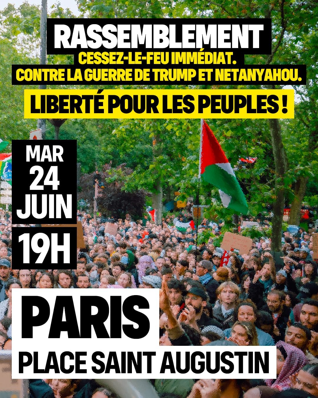 Contre la guerre de Trump et Netanyahou et contre le génocide à Gaza, nous appelons à Paris à un rassemblement mardi 24 juin à 19H00, place Saint Augustin.