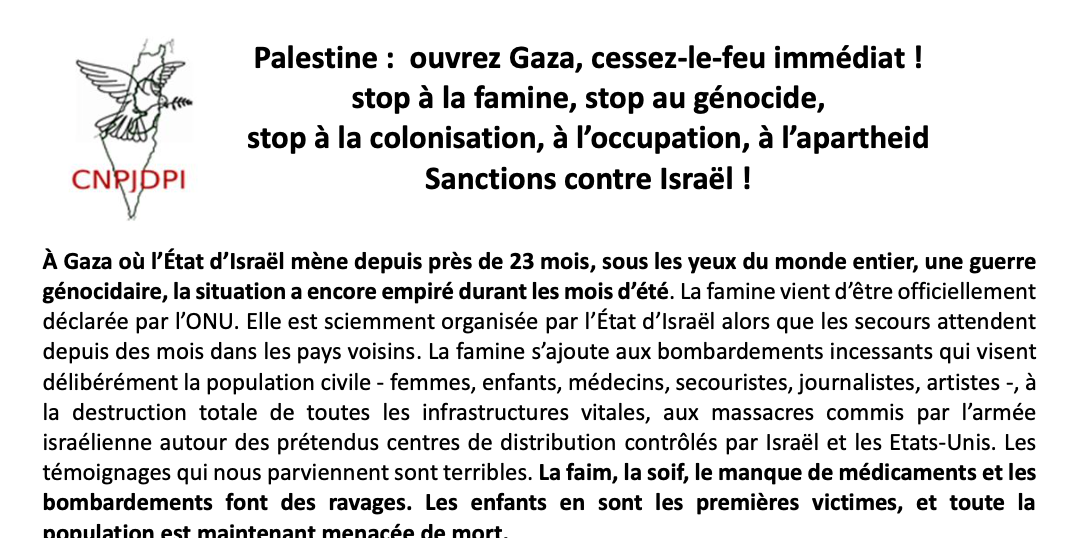 Le Collectif National pour une Paix Juste et Durable entre Palestiniens et Israéliens (CNPJDPI) dénonce depuis des mois la guerre génocidaire menée par l’État israélien contre le peuple palestinien. Dans une impunité totale, avec l’appui actif des Etats-Unis et en l’absence de sanctions de l’Union européenne, l’État d’Israël viole en permanence le droit international, et ne fait pas mystère de son projet de déporter ou d’éliminer la population palestinienne. C’est une honte pour l’humanité, qui va durablement marquer notre siècle.