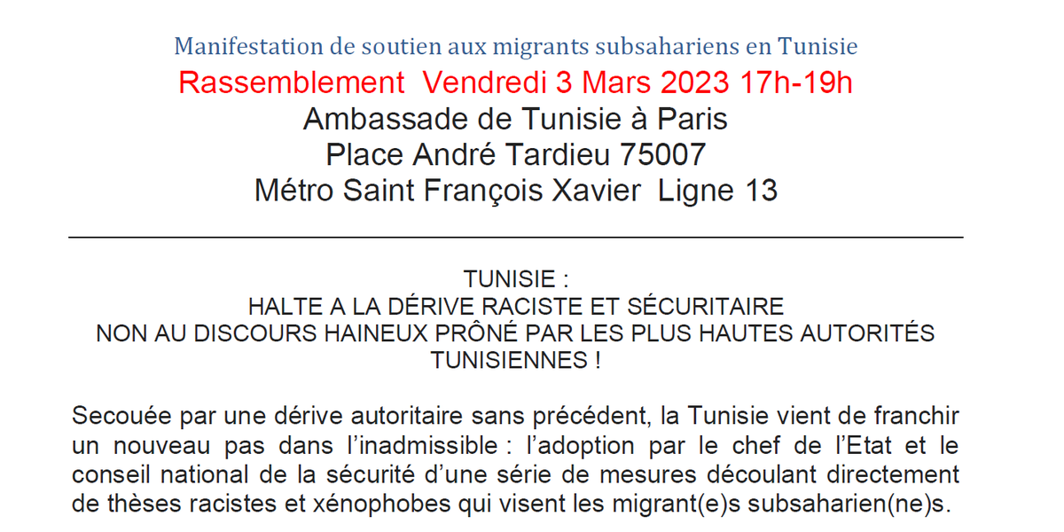 Rassemblement Vendredi 3 Mars 2023 17h-19h // Ambassade de Tunisie à Paris (Place André Tardieu 75007 - Métro Saint François Xavier Ligne 13)