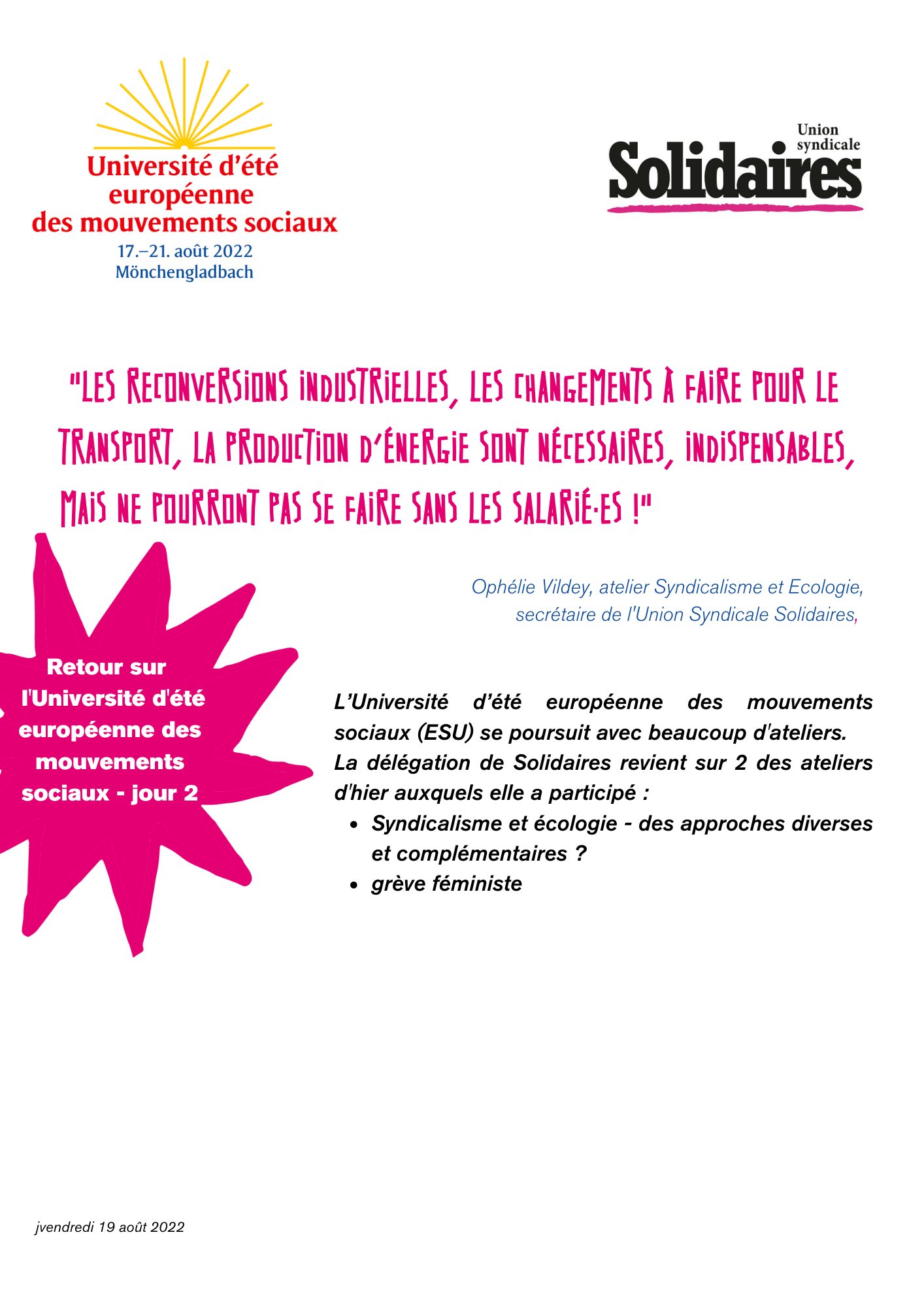Atelier Syndicalisme et écologie - des approches diverses et complémentaires ? - 18 Août 2022 - avec Ophélie Vildey pour Solidaires