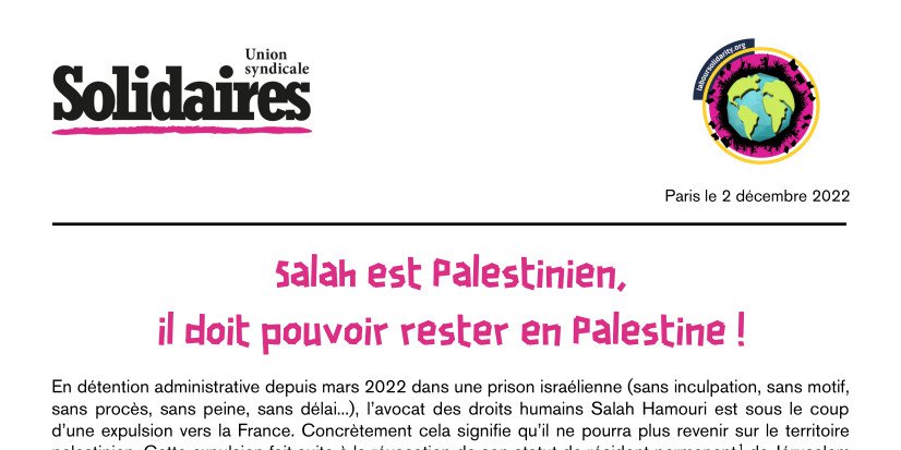 L’union syndicale Solidaires demande, aux côtés du comité de soutien de Salah Hamouri, que la France agisse avec détermination pour s’opposer à cette décision.