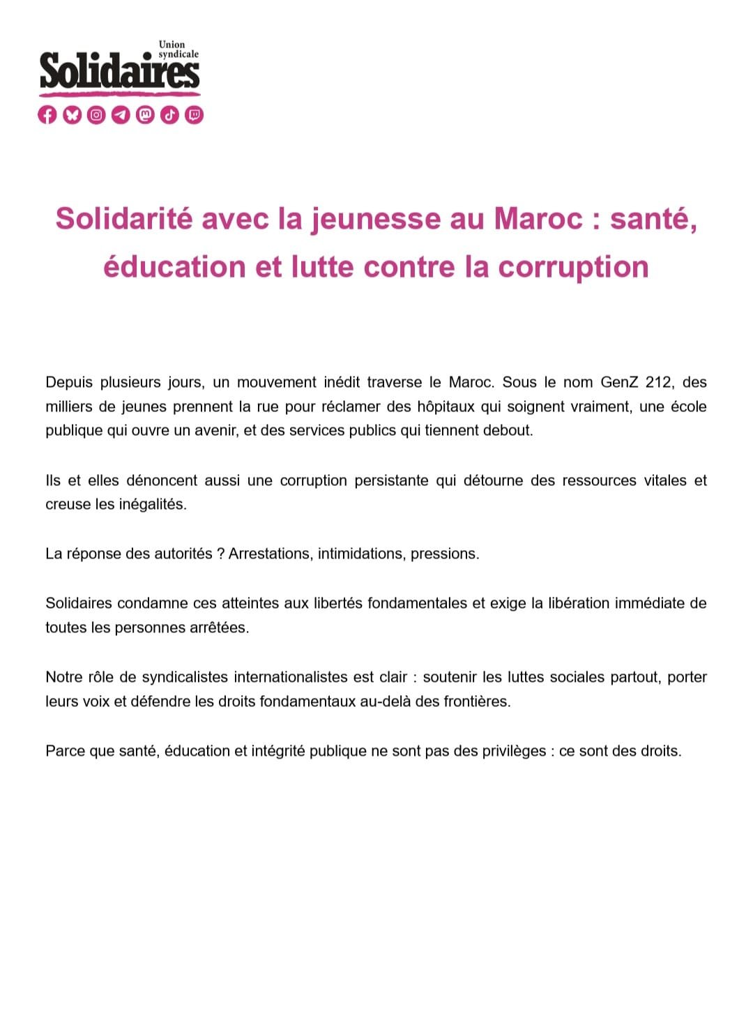 Solidarité avec la jeunesse au Maroc: santé, éducation et lutte contre la corruption !