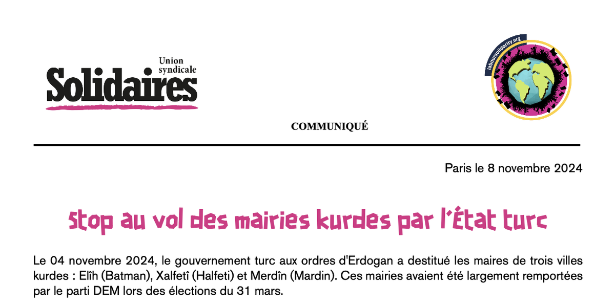 L'Union syndicale Solidaires réaffirme son soutien à la lutte du peuple kurde pour ses droits, et en particulier aux travailleuses et aux travailleurs visés par l'autoritarisme d'Erdogan.