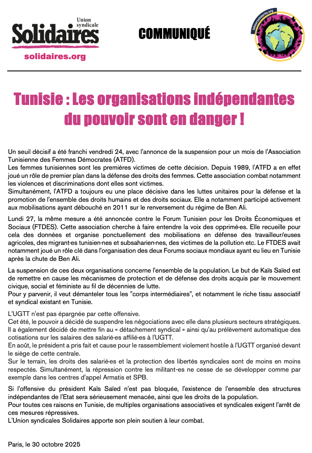 Lundi 27, la même mesure a été annoncée contre le Forum Tunisien pour les Droits Économiques et Sociaux (FTDES). Cette association cherche à faire entendre la voix des opprimé·es. Elle recueille pour cela des données et organise ponctuellement des mobilisations en défense des travailleur/euses agricoles, des migrant·es tunisien·nes et subsaharien·nes, des victimes de la pollution etc. Le FTDES avait notamment joué un rôle clé dans l'organisation des deux Forums sociaux mondiaux ayant eu lieu en Tunisie après la chute de Ben Ali.