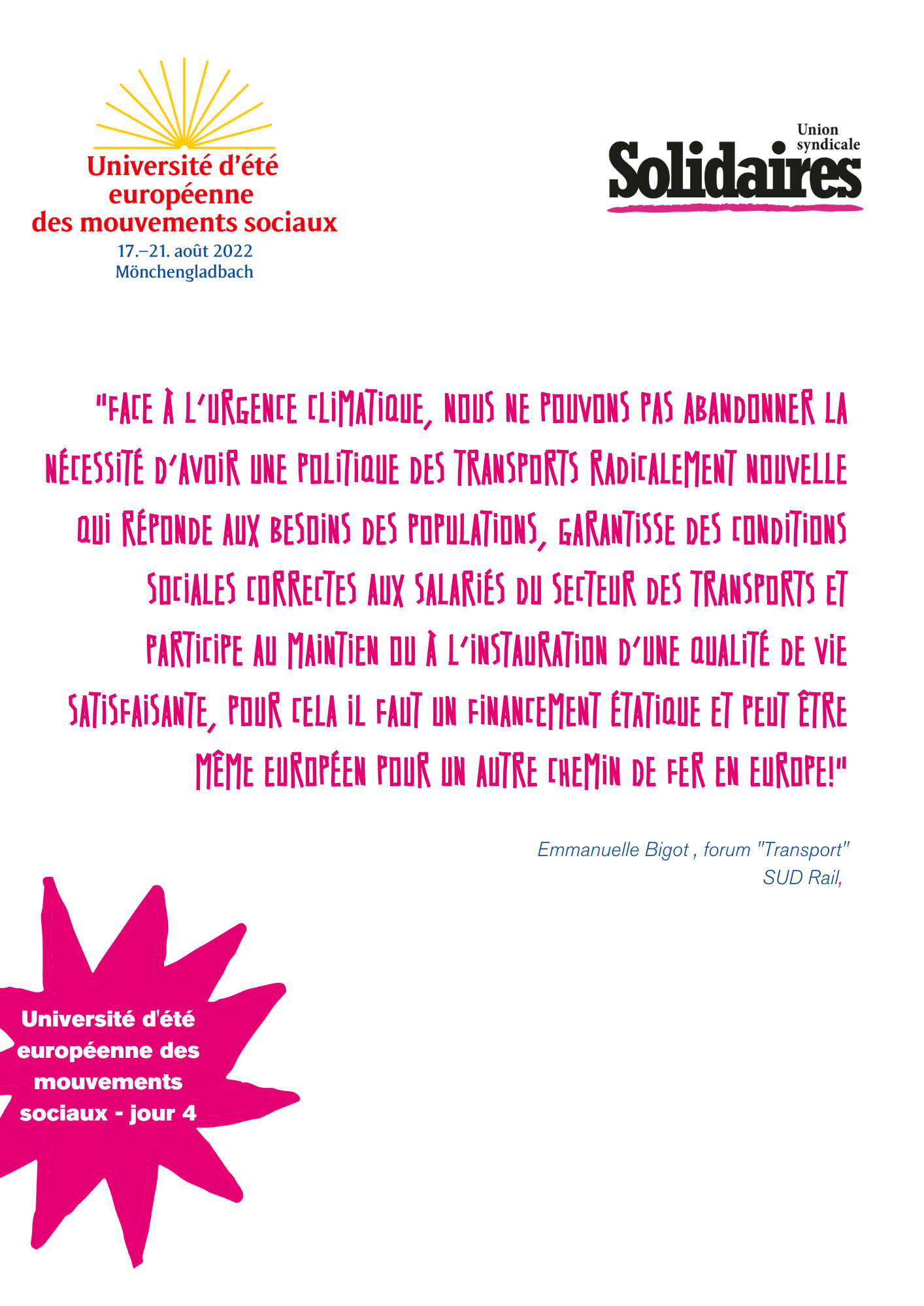 Face à l’urgence climatique, nous ne pouvons pas abandonner la nécessité d’avoir une politique des transports radicalement nouvelle qui réponde aux besoins des populations, garantisse des conditions sociales correctes aux salariés du secteur des transports et participe au maintien ou à l’instauration d’une qualité de vie satisfaisante, pour cela il faut un financement étatique et peut être même européen pour un autre chemin de fer en Europe.