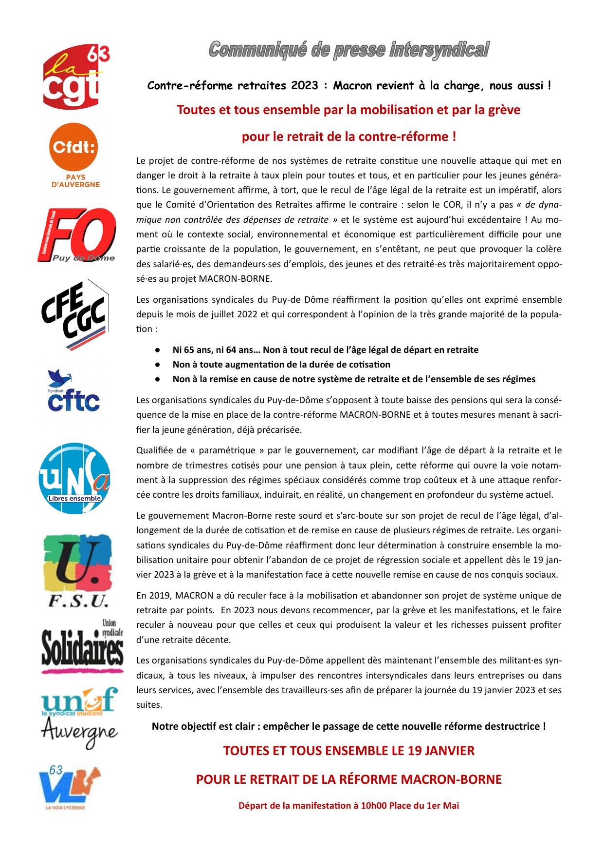 Le 12 Janvier, à la Maison du Peuple de Clermont-Ferrand, 20 représentant-e-s des organisations syndicales du Puy-de-Dome CGT, CFDT, FO, CFE-CGC, CFTC, Solidaires, FSU, UNEF et Voie Lycéenne se sont réunis pour construire localement une mobilisation qui s'inscrit dans la durée, pour gagner contre un gouvernement arc-bouté sur la volonté de nous faire toujours travailler plus longtemps.
