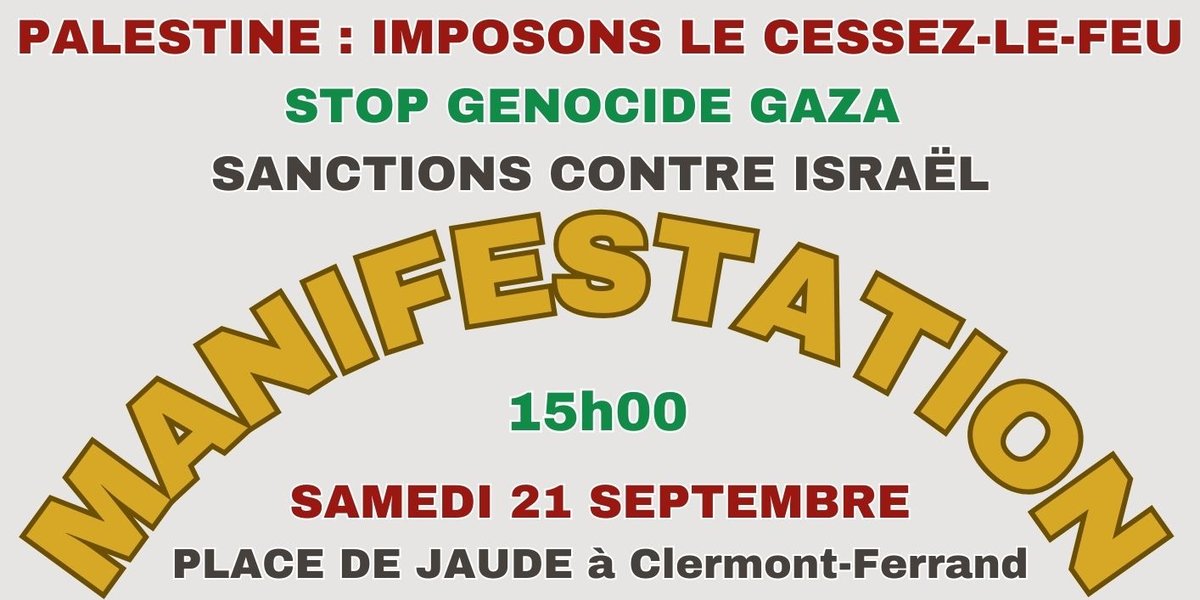 Rassemblement unitaire à l'appel du collectif pour une paix juste et durable 63 : Samedi 21 Septembre 2024 15h place de Jaude.