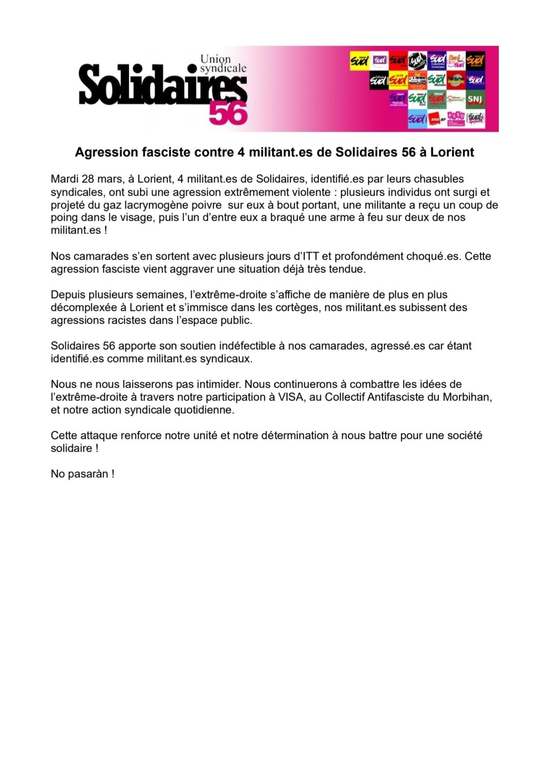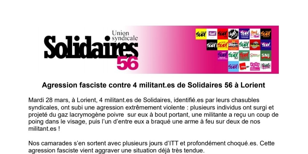 Agression fasciste contre 4 militant.es de Solidaires 56 à Lorient