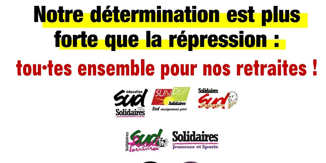 Le monde de l’éducation, de l’enseignement supérieur et la recherche (ESR) et de Jeunesse et Sports (JS), est pleinement engagé dans ce mouvement social et subit une répression intolérable. Des nombreuses et nombreux syndicalistes ont été arrêté·es alors qu’elles et ils usaient de leur droit à manifester contre le 49.3. De même, le gouvernement bafoue le droit des lycéen·nes et des étudiant·es à se mobiliser en les réprimant violemment. Leur colère est légitime et elle doit pouvoir s’exprimer sur leurs lieux d’étude. Les gardes à vue et les violences policières : usage de gaz lacrymogènes, matraquages, arrestations… que subit la lycéen·nes, étudiant·es et apprenti·es sont inacceptables. Des jeunes, femmes et personnes LGBTQIA+, dénoncent des violences sexuelles et sexistes lors d’interventions policières.