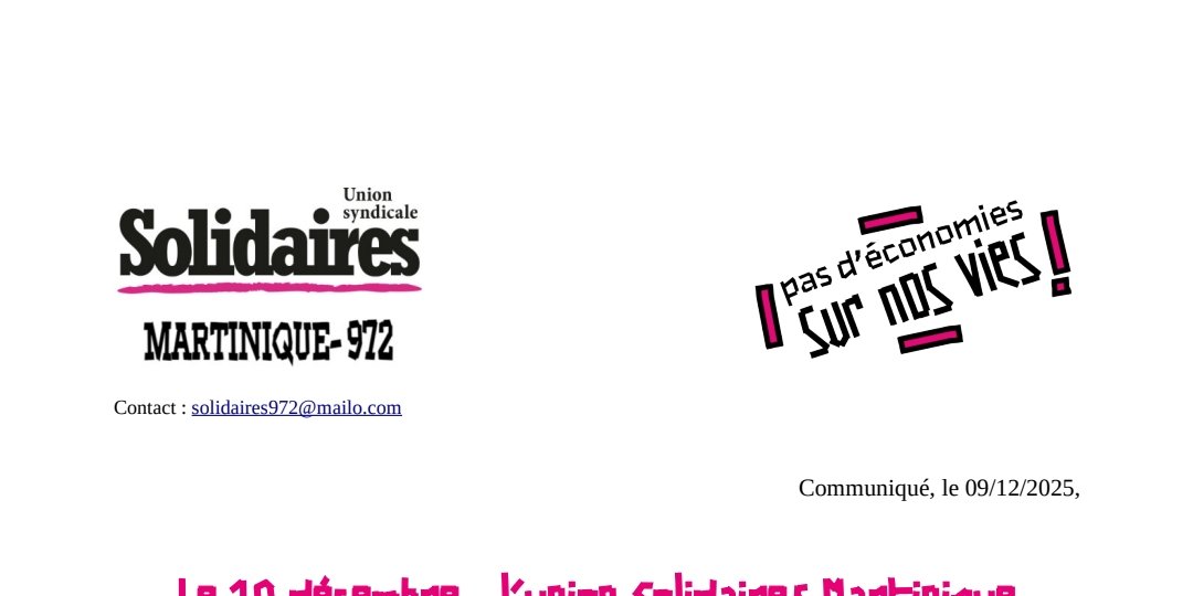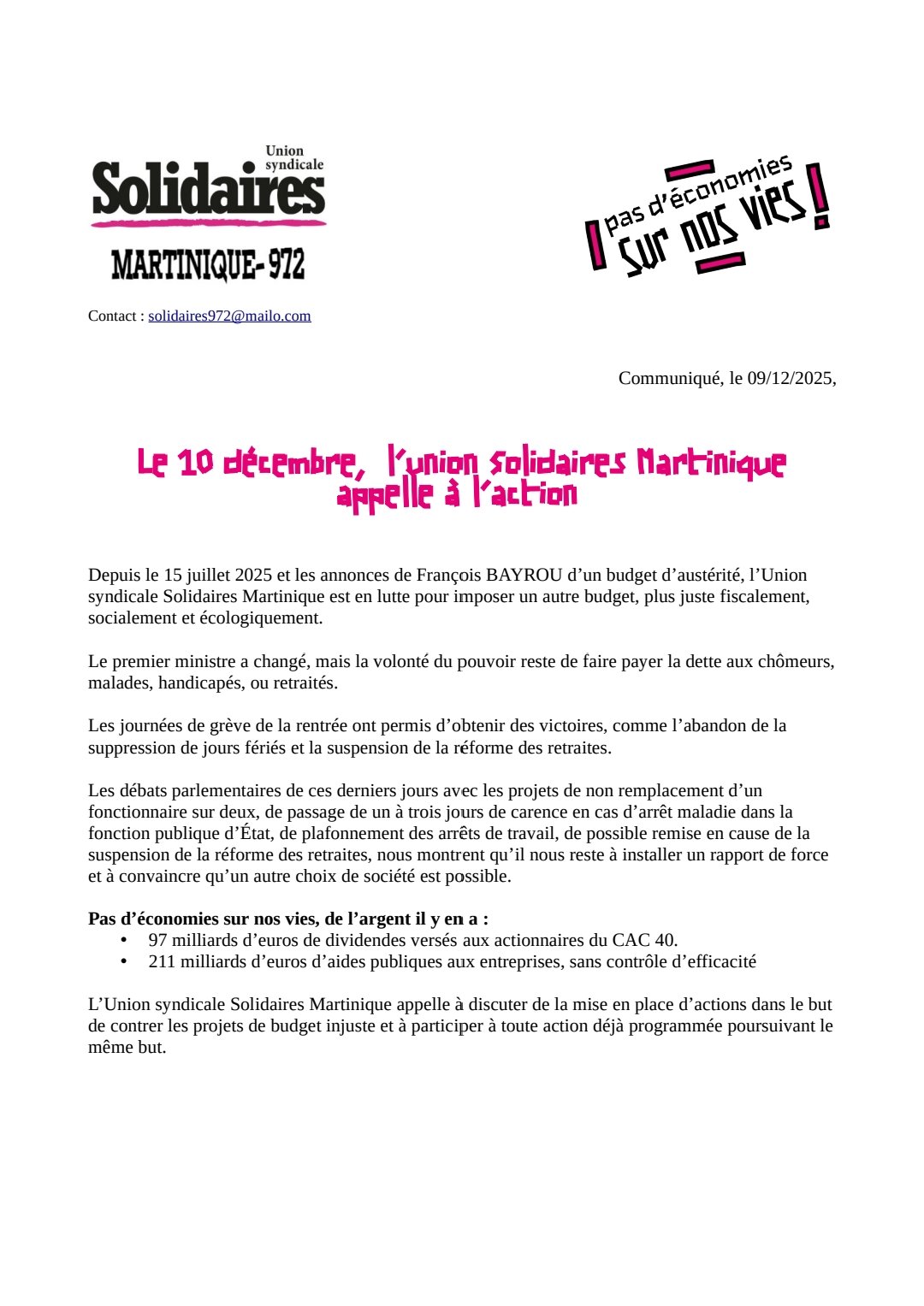 L’Union syndicale Solidaires Martinique appelle à discuter de la mise en place d’actions dans le but de contrer les projets de budget injuste et à participer à toute action déjà programmée poursuivant le même but.