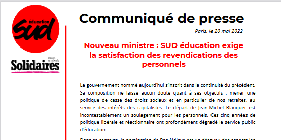 Pour en savoir plus, lire le communiqué de SUD Éducation daté du 20 Mai 2022. C'est LA