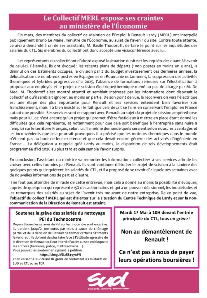 Contre le démantèlement du site, la CGT et SUD Renault Lardy appelle à faire grève et se rassembler mardi 18 mai de 10h à 11H devant le site.