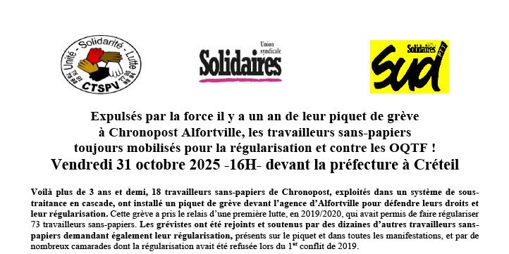Expulsés par la force il y a un an de leur piquet de grève à Chronopost Alfortville, les travailleurs sans-papiers toujours mobilisés pour la régularisation et contre les OQTF ! Vendredi 31 octobre 2025 -16H- devant la préfecture à Créteil