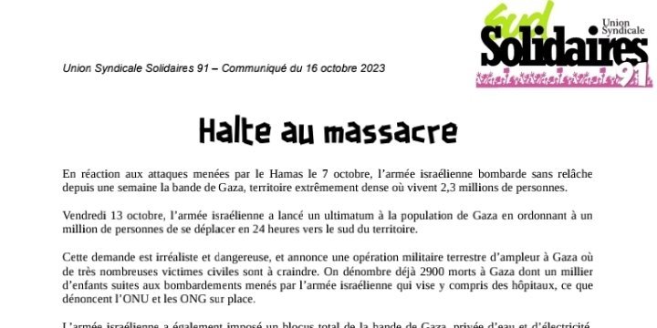 Il faut au contraire tout faire pour apporter notre soutien à la résistance palestinienne, et stopper le massacre en cours à Gaza. Au dela de cette urgence, il nous faut continuer d’éxiger, comme l’Union Syndicale Solidaires l’a toujours fait, la fin de l’occupation et de l’apartheid que subit le peuple palestinien. C’est à cette condition seulement que pourra enfin advenir une paix durable dans la région.