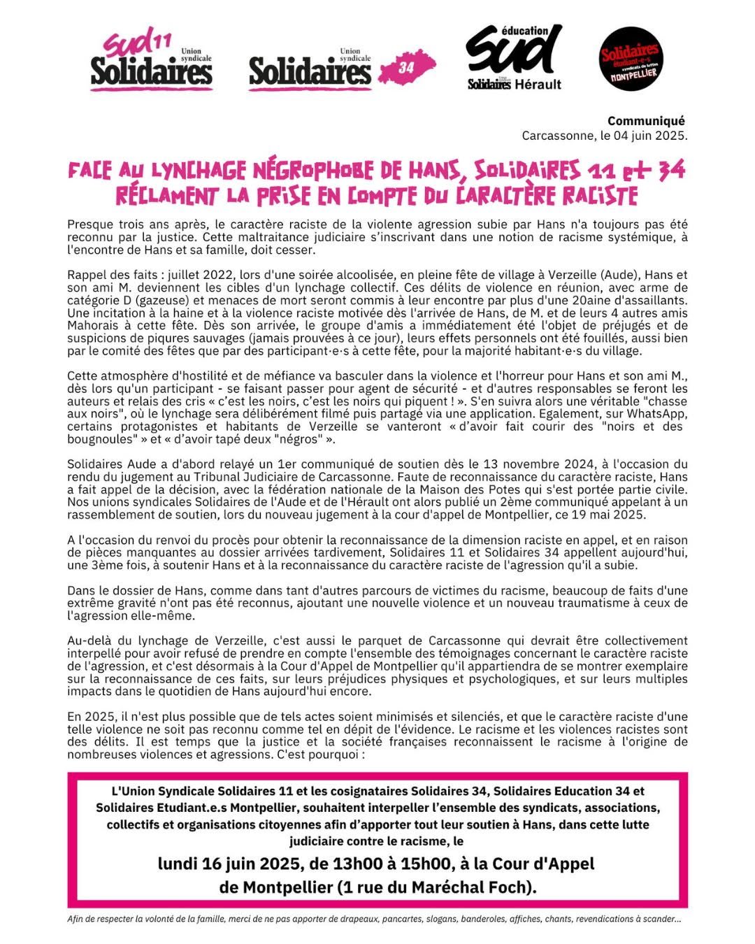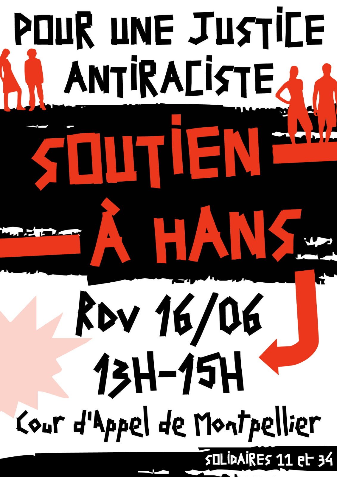 L'Union syndicale Solidaires 11 et les cosignataires Solidaires 34, Sud Educ 34 et Solidaires Etudiant.e.s Montpellier, souhaitent interpeller l'ensemble des syndicats, associations, collectifs et organisations citoyennes afin d'apporter tout leur soutien à Hans, dans cette lutte judicaire contre le racisme