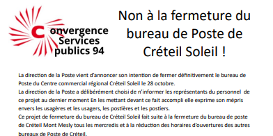 Non à la fermeture du bureau de Poste de Créteil Soleil ! La direction de la Poste vient d’annoncer son intention de fermer définitivement le bureau de Poste du Centre commercial régional Créteil Soleil le 28 octobre. La direction de la Poste a délibérément choisi de n’informer les représentants du personnel de ce projet au dernier moment En les mettant devant ce fait accompli elle exprime son mépris envers les usagères et les usagers, les postières et les postiers. Ce projet de fermeture du bureau de Créteil Soleil fait suite à la fermeture du bureau de poste de Créteil Mont Mesly tous les mercredis et à la réduction des horaires d’ouvertures des autres bureaux de Poste de Créteil. La fermeture du bureau de Poste va pénaliser les visiteurs fréquentant Créteil Soleil ainsi que les professionnels de santé et les commerçants installés dans le centre commercial. C'est, selon les chiffres communiqués par La Poste, plus de 400 personnes en moyenne qui fréquentaient chaque jour le bureau de Créteil Soleil en 2020, malgré la pandémie de Covid et le confinement ! Par ailleurs, la disparition de tous les distributeurs de billets du bureau de Poste va réduire de plus du quart leur nombre total à l'intérieur du centre. Cette fermeture provoquera également un allongement de l’attente, un accueil et des conditions de travail dégradés dans les autres bureaux de Poste de Créteil. Cette décision s’inscrit dans une politique d’austérité qui sape tous les services publics. Cette politique et cette décision sont inacceptables !